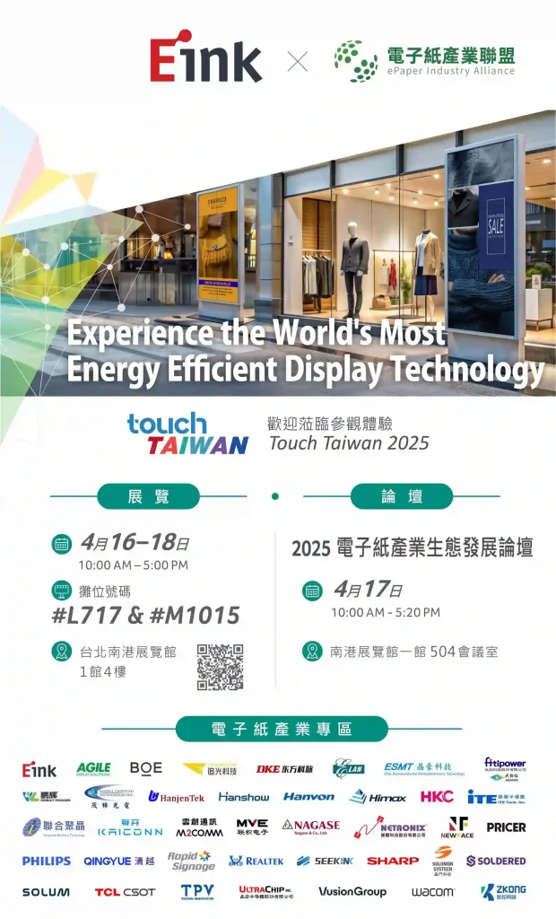 TouchTaiwan2025將在4月16日至18日,於台北南港展覽館1館4樓的 E Ink ePaper 合作夥伴展館 L1030展出。